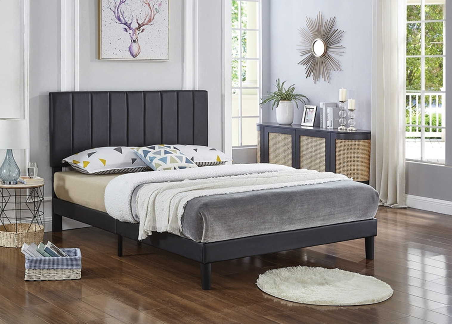 Black faux leather covers the headboard, and sides of this platform bed. The headboard features an appealing vertical stripe design. This modern, clean design fits into any budget. Bed has mattress support built-in, box spring is not required but recommended for lower profile and heavier weight mattresses. Headboard height is adjustable from 44”- 49”. Easy assembly.