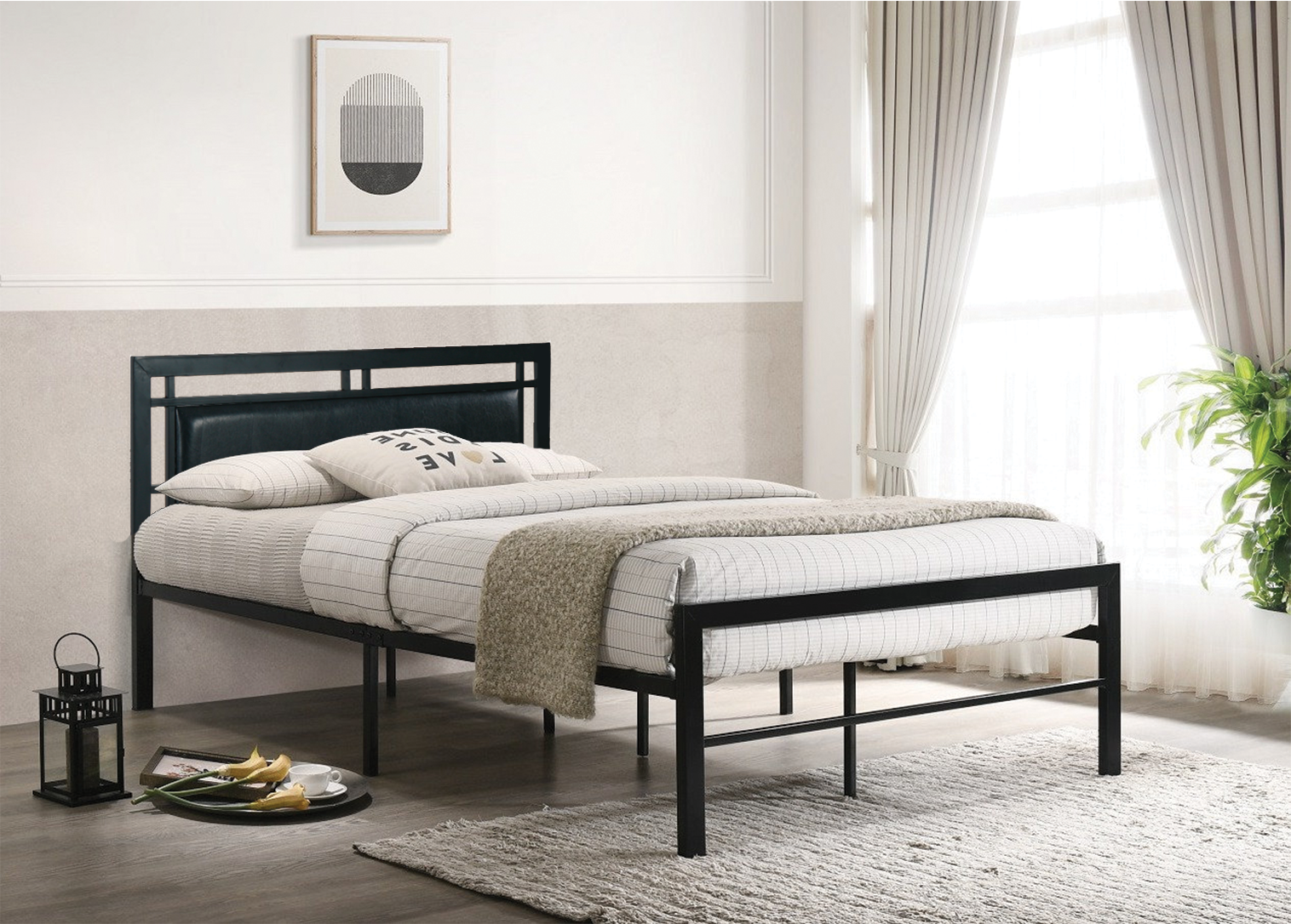 Black metal bed with a faux leather design on the headboard. Bed is made of strong metal tubing, with a padded faux leather headboard. Our lowest cost bed fits into any budget, whether you’re a new student, or adding a bed for guests. Boxspring is not required with bed, but is highly recommended for lower profile mattresses. You will not be disappointed with your purchase.
