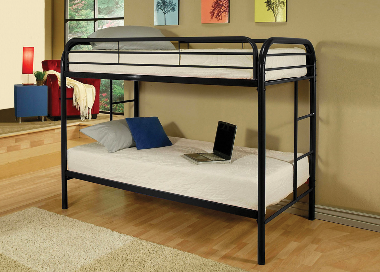 Classic metal tubing bunk bed in black colour. Bed is a twin on top of twin. Ladders for easy access on both sides. Mattress supports are built-in to the bed, box springs are not required. Basic bed, fits any budget and space. Assembly required. Delivered in one package.