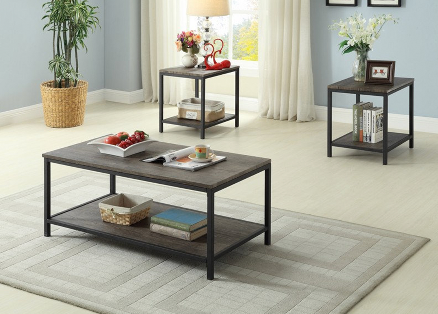 This 3-piece Coffee Table SM 2008 Set comes with a wooden coffee table and two matching end tables. Supported by a metal base, the set features a distressed grey finish for a stylish, contemporary look. Perfect for small living spaces, this set will give your home a modern touch.