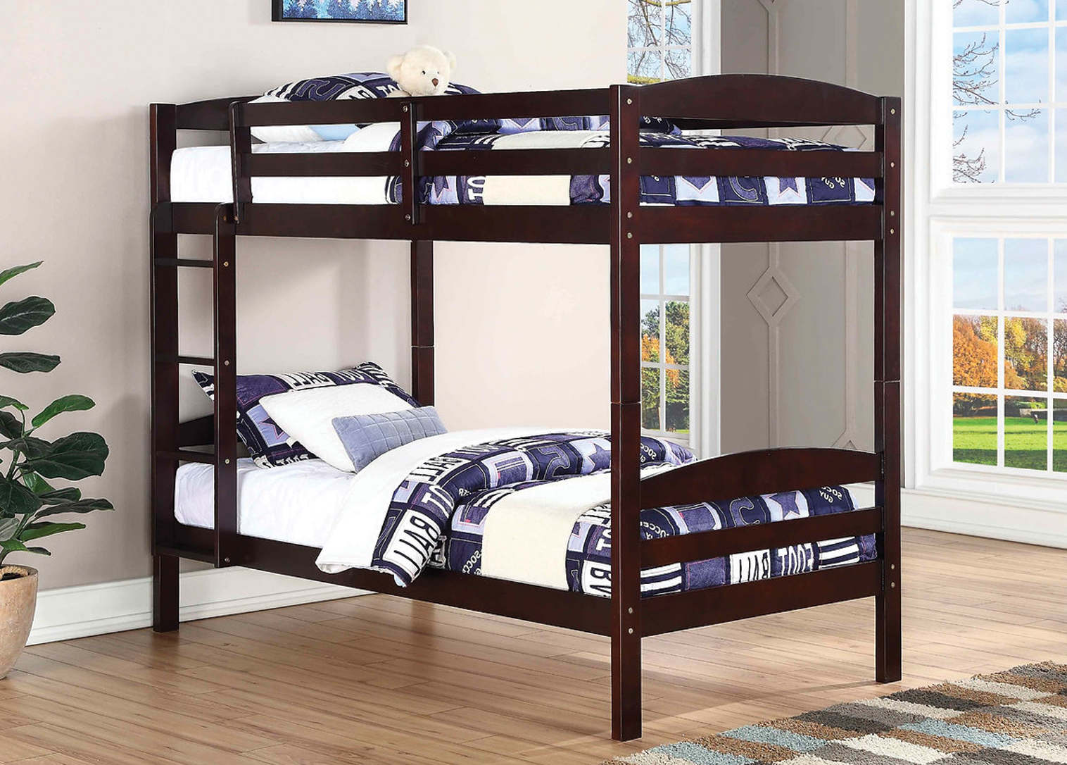 Wooden twin on twin bunk bed in espresso black colour. Modern styling and design. Can be converted to two individual twin size beds. Mattress supports are built-in to the bed, box springs are not required. Assembly required. Delivered in two packages.