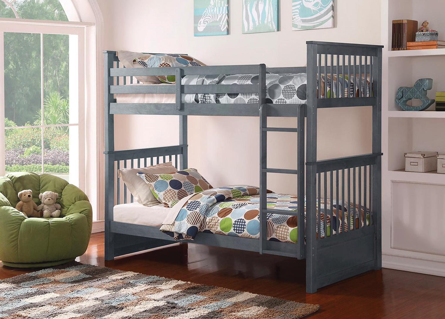Heritage style twin on twin bunk bed in grey colour. The bottom bunk has a taller head and footboard design. Ladder is made of wood as well. Can be converted to two individual twin size beds. Mattress supports are built-in to the bed, box springs are not required. Assembly required. Delivered in two packages.