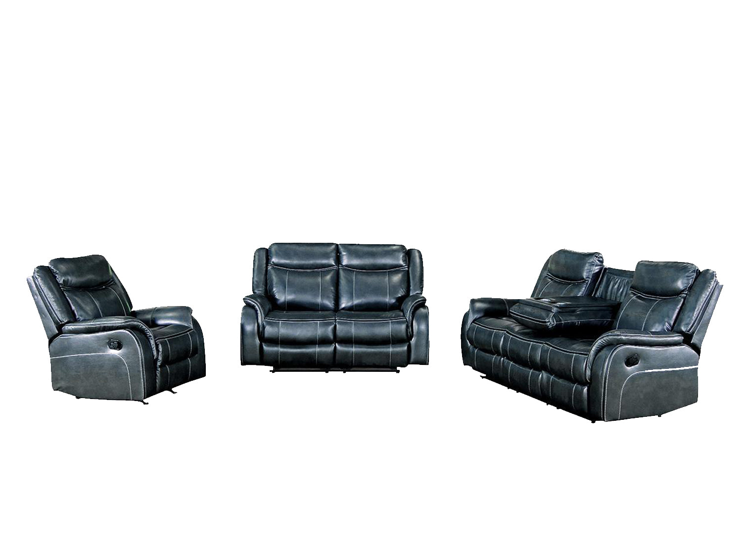 - Designed for utmost comfort and support, this sofa set has generously padded arms, high thick back, cup holders and high-grade Leathaire upholstery in charcoal grey.