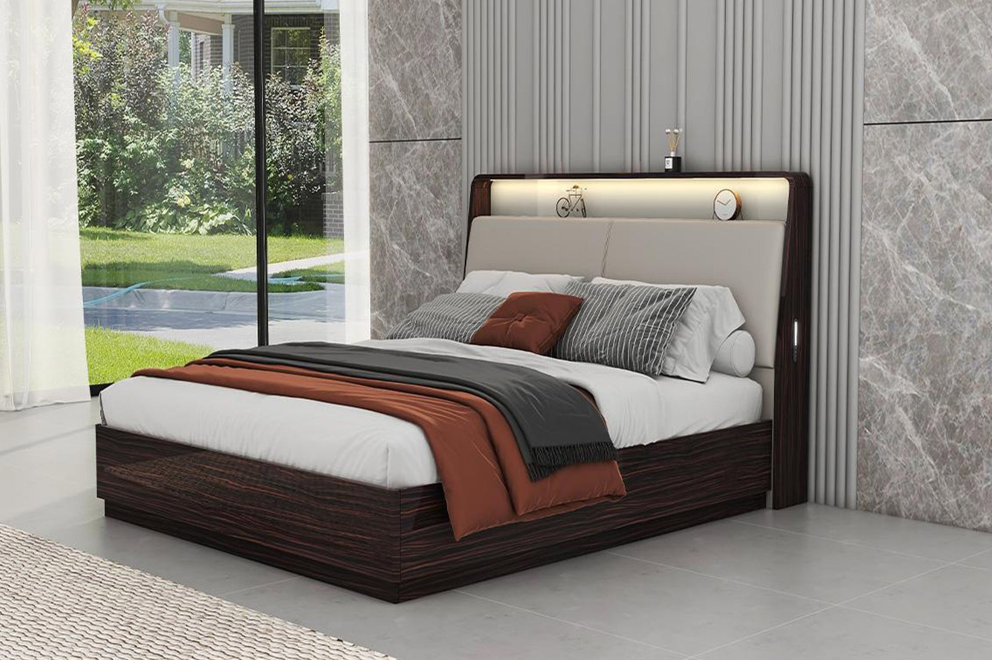 High-gloss grey & ebony lacquer finish with a hydraulic storage lift, open drawer storage in the headboard, built-in LED lighting, and side night lights with USB/C charging ports—perfect for late-night convenience. -