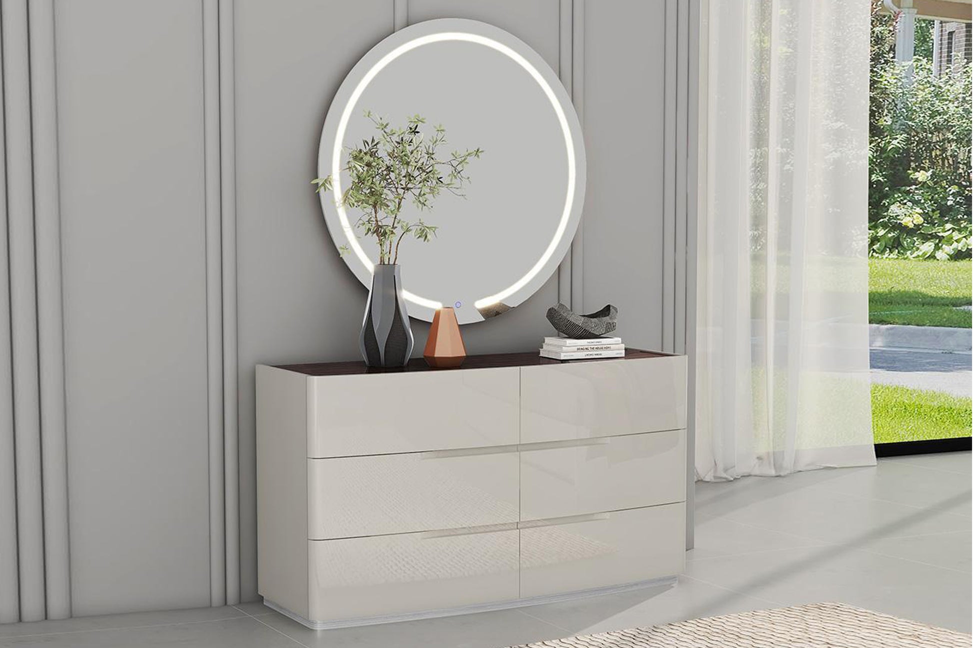 Features multiple roomy drawers plus a hidden jewelry drawer with divided sections—ideal for rings, bracelets, watches, and valuables. -
