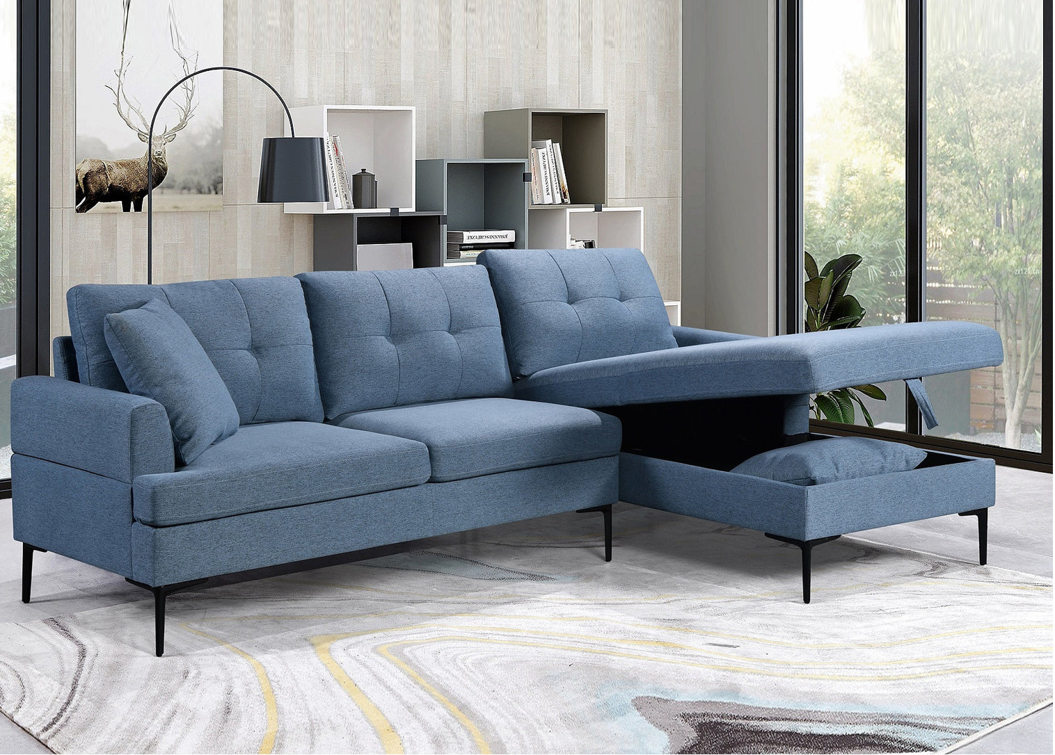 The Mingle sectional features a comfortable right-hand facing chaise, perfect for lounging. It includes a large pull-up storage compartment for added convenience, along with button tufting on the back cushions for a touch of sophistication. The sleek black metal legs offer a modern contrast, while the soft blue fabric and accent pillows complete the inviting look. Ideal for both style and functionality.