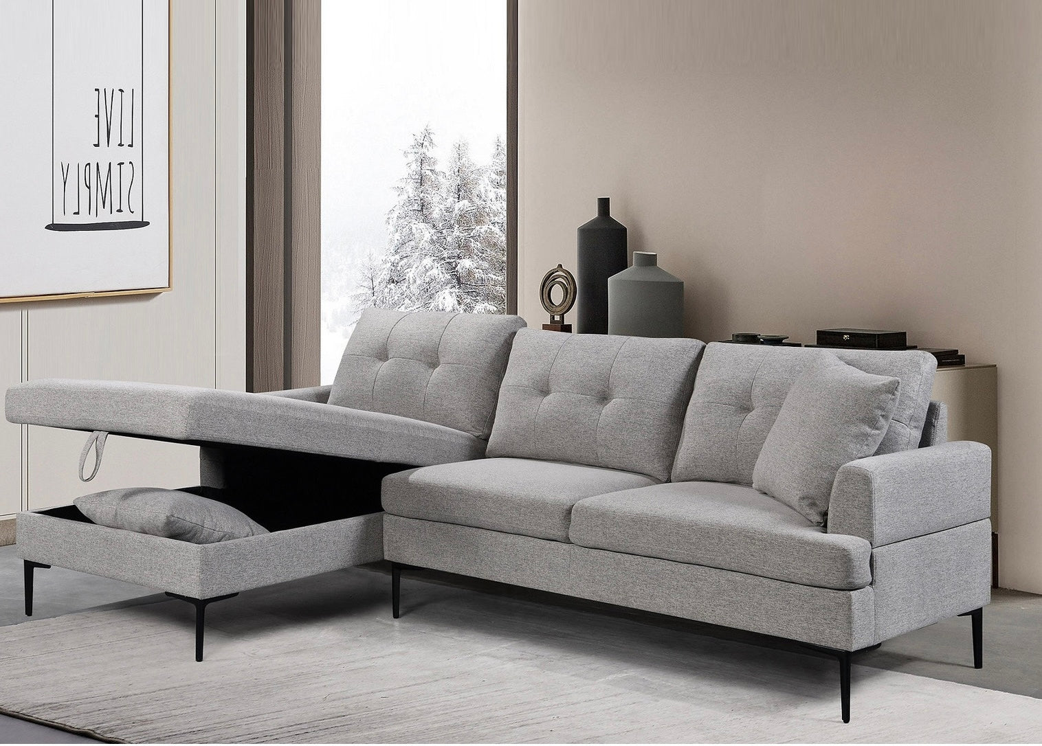 The Mingle sectional features a comfortable right-hand facing chaise, perfect for lounging. It includes a large pull-up storage compartment for added convenience, along with button tufting on the back cushions for a touch of sophistication. The sleek black metal legs offer a modern contrast, while the soft grey fabric and accent pillows complete the inviting look. Ideal for both style and functionality.