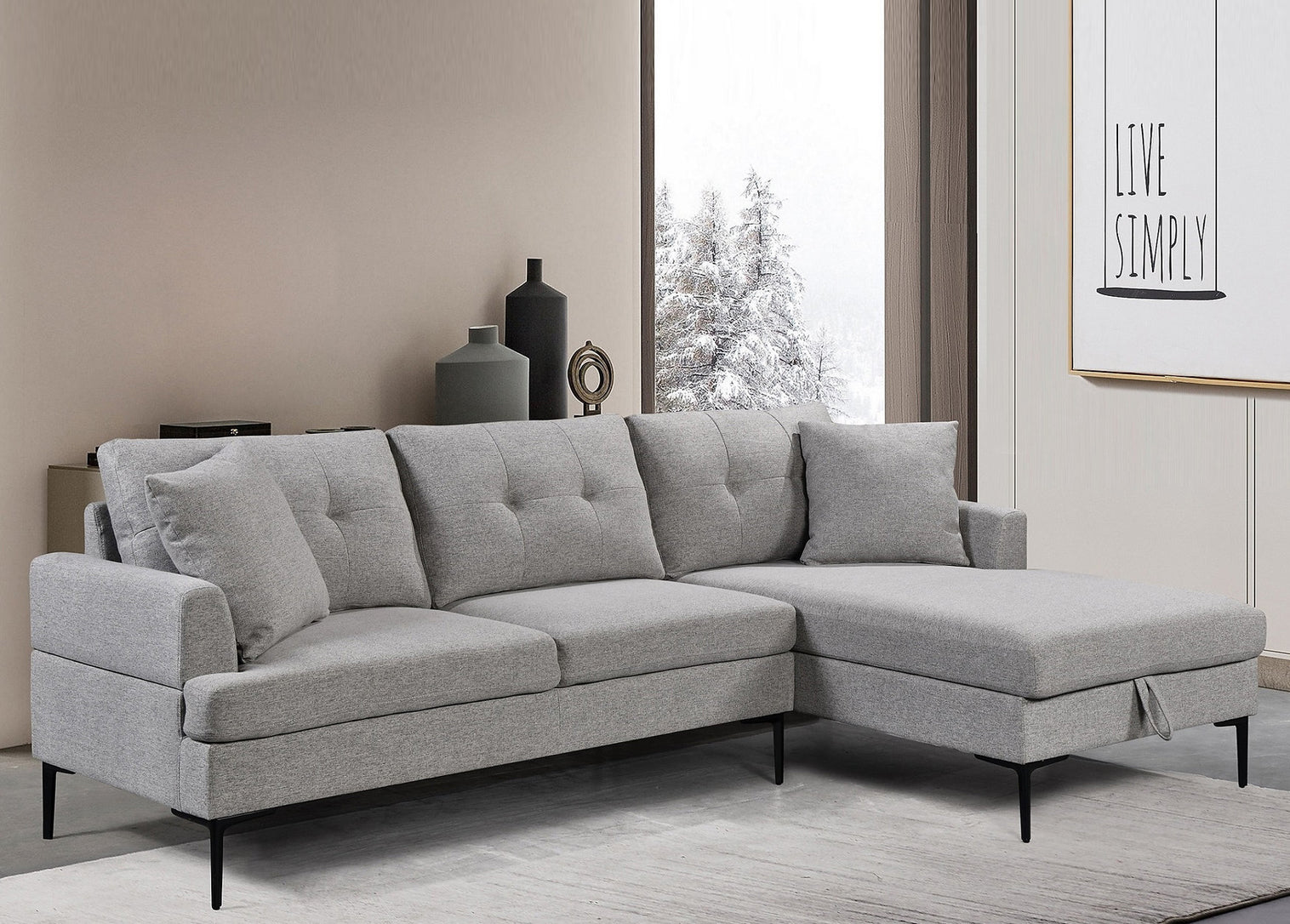 The Mingle sectional features a comfortable right-hand facing chaise, perfect for lounging. It includes a large pull-up storage compartment for added convenience, along with button tufting on the back cushions for a touch of sophistication. The sleek black metal legs offer a modern contrast, while the soft grey fabric and accent pillows complete the inviting look. Ideal for both style and functionality.