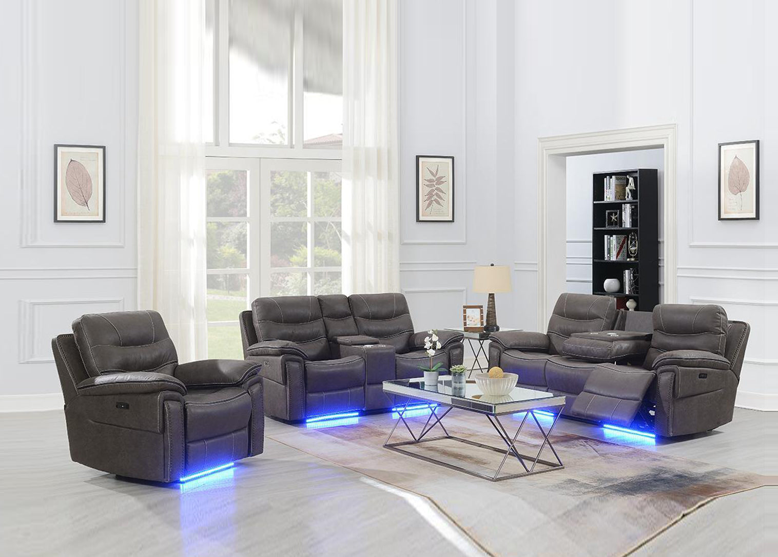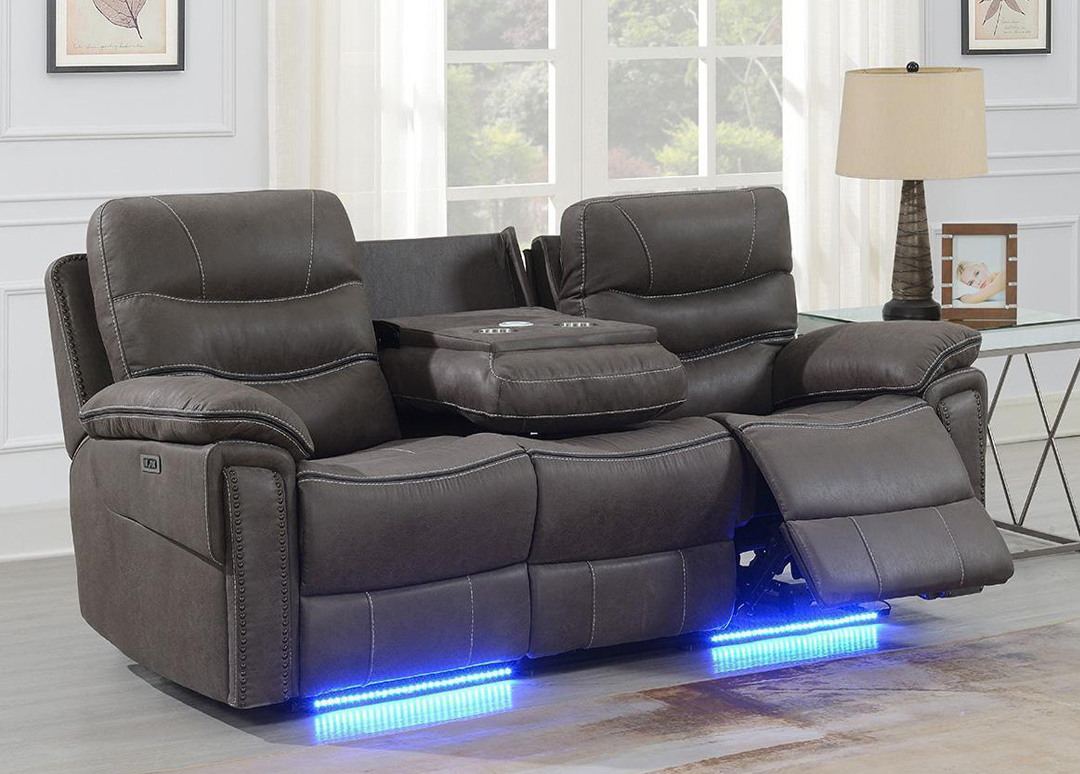 - Sofa with power recliners and power headrests, drop down tray with wireless charger and USB port;
