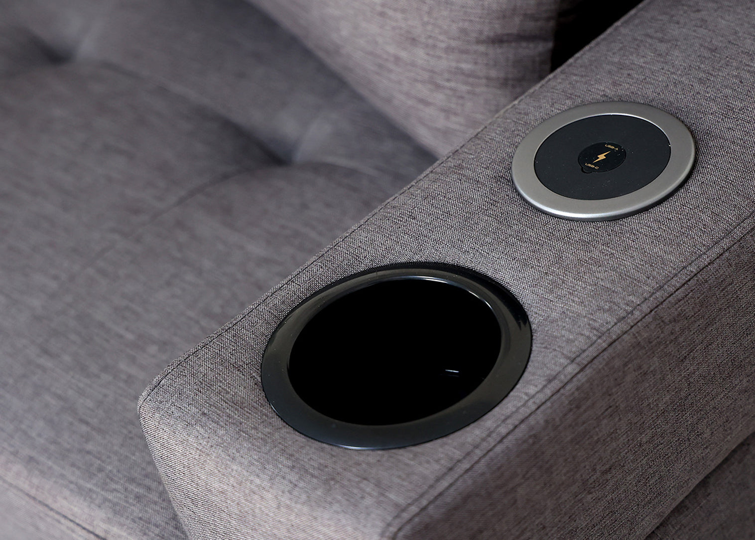 Expertly crafted with a reversible design, the Newton Reversible sectional offers both style and functionality. Covered in a chic grey fabric with tufted details, this sectional features built-in cupholders and a wireless charger, making it perfect for modern, tech-savvy homes. Includes accent pillows for added comfort.