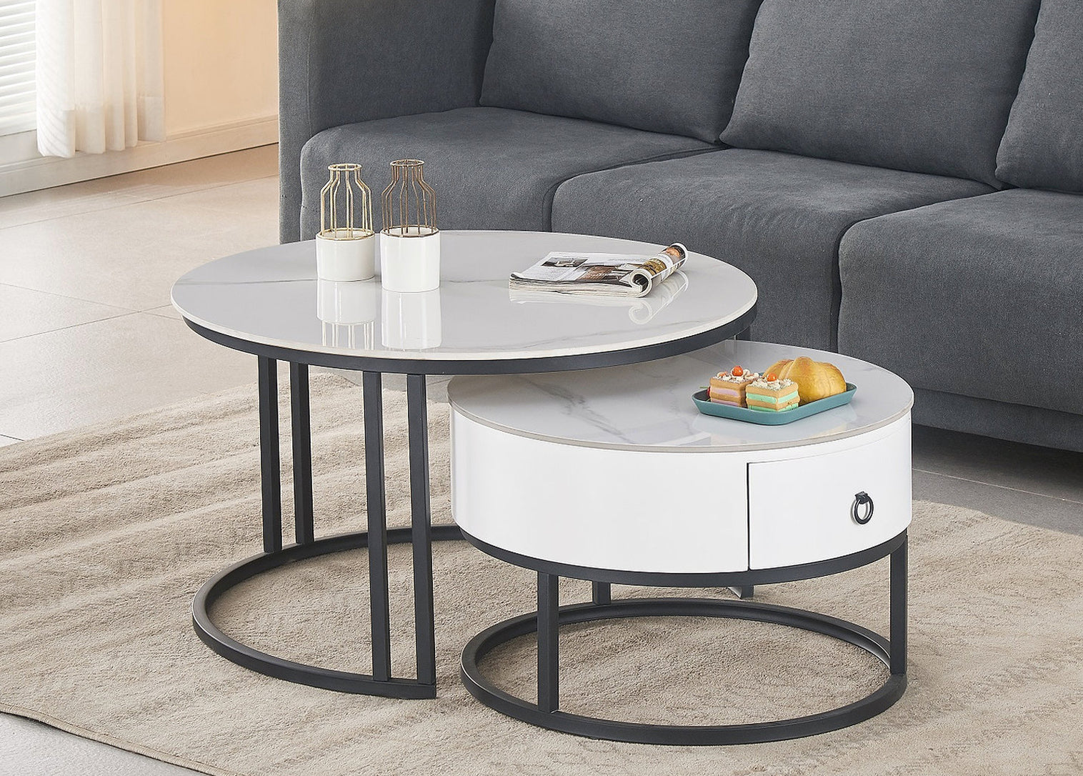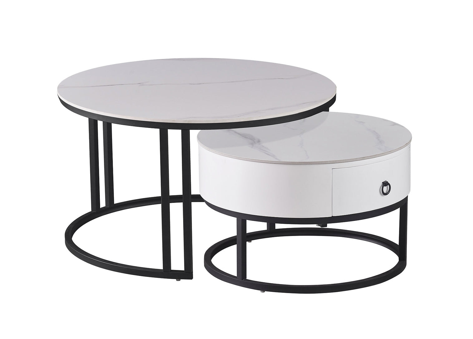 This set of 2 coffee tables features a luxurious sintered stone white marble top paired with a durable black steel base, creating a sleek and modern aesthetic. The large table has a 32" round top and stands 18" high, while the smaller table measures 24" round and 15" high. The small table also includes a convenient storage drawer with black hardware, adding both style and functionality to your living space. Perfect for modern interiors looking for elegance and practicality. IF 2669