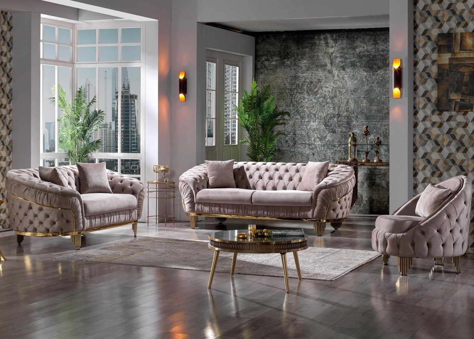 Introducing the Vaness Taupe Luxury Sofa Set, an ultra modern set of furniture that adds sophistication and class to your living room. With a premium design featuring tufted cushions, gold accents, and gold legs, this sofa set is built to last using the best quality materials. Look no further for an elegant and modern piece of furniture for your home.