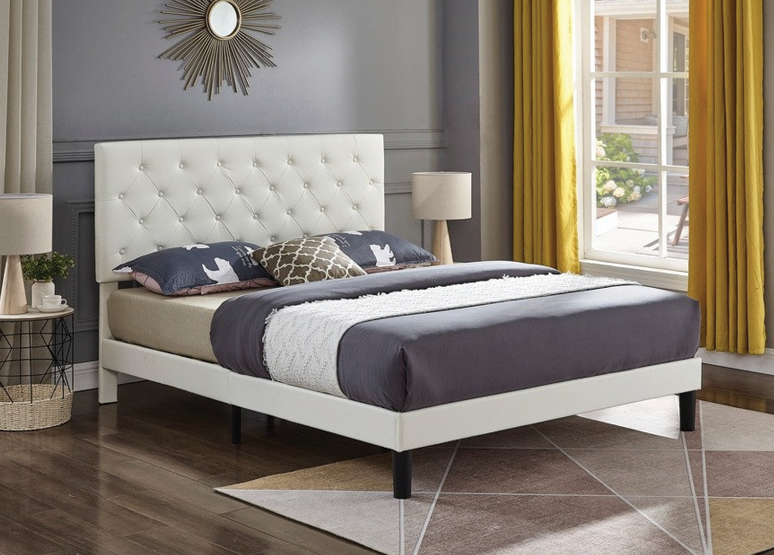 Platform bed with faux white leather on headboard, footboard and sides. Headboard has a great tufted design with buttons, and adds a luxurious feel to any bedroom. Mattress supports are built-in, but a box spring is recommended for lower profile and heavy weight mattresses. Headboard height is adjustable from 44”- 49”. Easy assembly.