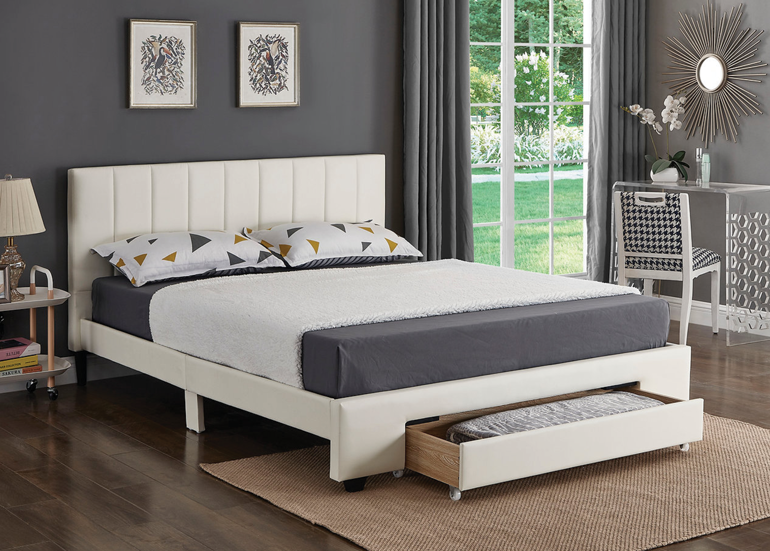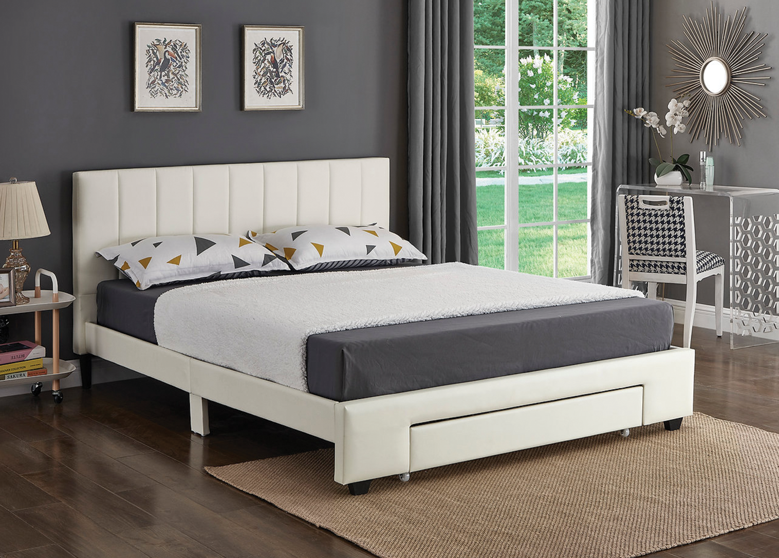 White faux leather covers the headboard, and sides of this platform bed. The headboard features an appealing vertical stripe design. This modern, clean design fits into any budget. There is a large storage door that pulls out from the footboard. Bed has mattress supports built-in, box spring is not required but recommended for lower profile and heavier weight mattresses. Easy assembly.